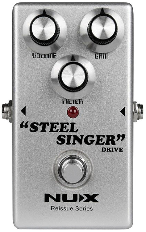 Reissue series drive pedal for guitar or bass. The Steel Singer Drive simulates a high end boutique tube amplifier, delivering a transparent mild to medium driven gain, much revered by many famous guitar players. All analog circuitry ensures a pure signal path and a filter control provides a single intuitive EQ adjustment. Subtle gain to smoothly overdriven tones for blues, pop and rock styles.